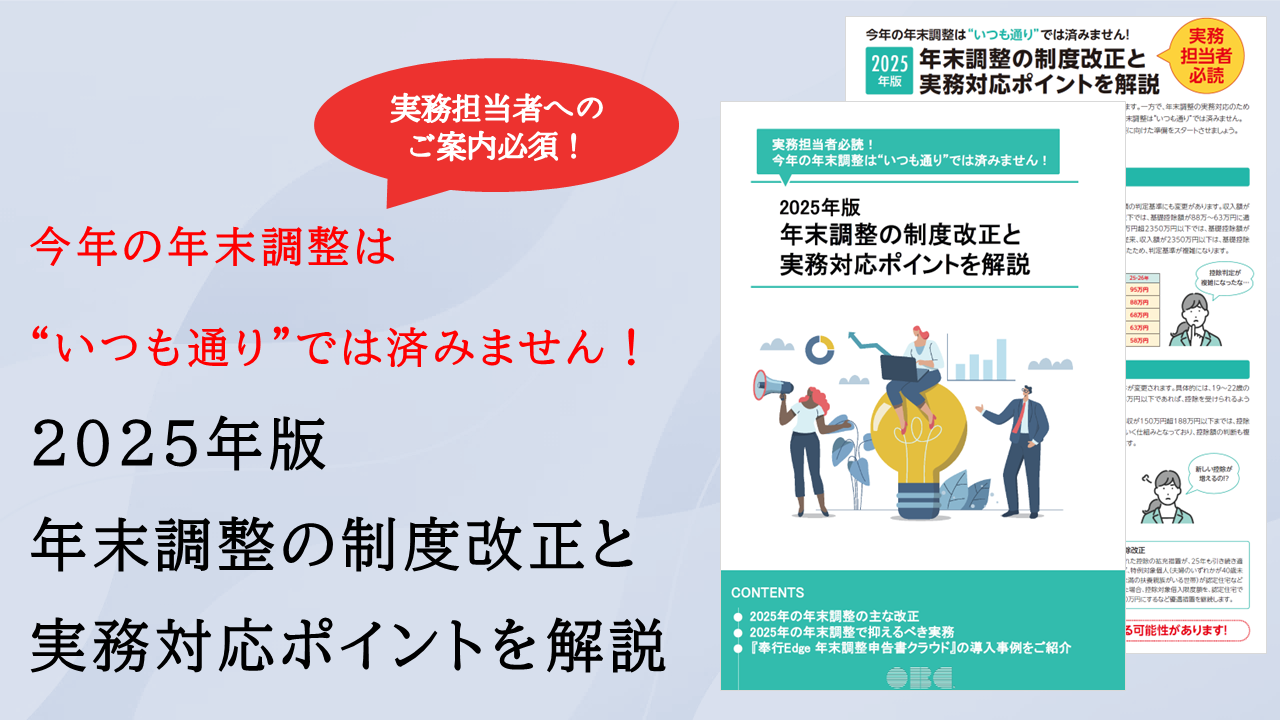 2025年の年末調整は制度改正によって「いつも通り」では済まされない年になります。制度改正の内容と、それに伴う実務対応のポイントを整理した資料をご用意しました。2025年の年末調整で求められる実務対応を具体的に解説するとともに、今後も続くと予想される制度改正への備え方についてもヒントを掲載しています。年末調整業務を効率化する「奉行Edge 年末調整申告書クラウド」についてのご紹介もありますので、ぜひ実務担当者の方へご案内ください。